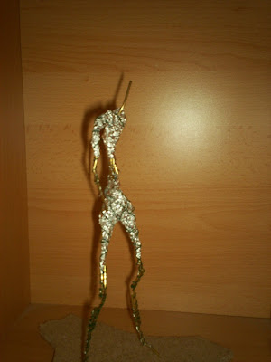 Dafür Rödelt man ersteinmal ein grobes Drahtgerüst zusammen, am besten man biegt es so, wie die Figur einmal ausehen soll. Ich benutze dafür stabilen Messingdraht, den ich nochmal mit Blumendraht umwickle. Diesen Draht umhüllt man Schichtweise mit einer PVC Modelliermasse, also wie erwähnt dieses Fimo und oder Sculpey, welches im Ofen gehärtet wird. Die Kunst ist es immer mehr Material sauber aufzubringen, und somit eine schöne Körperform zu modellieren.